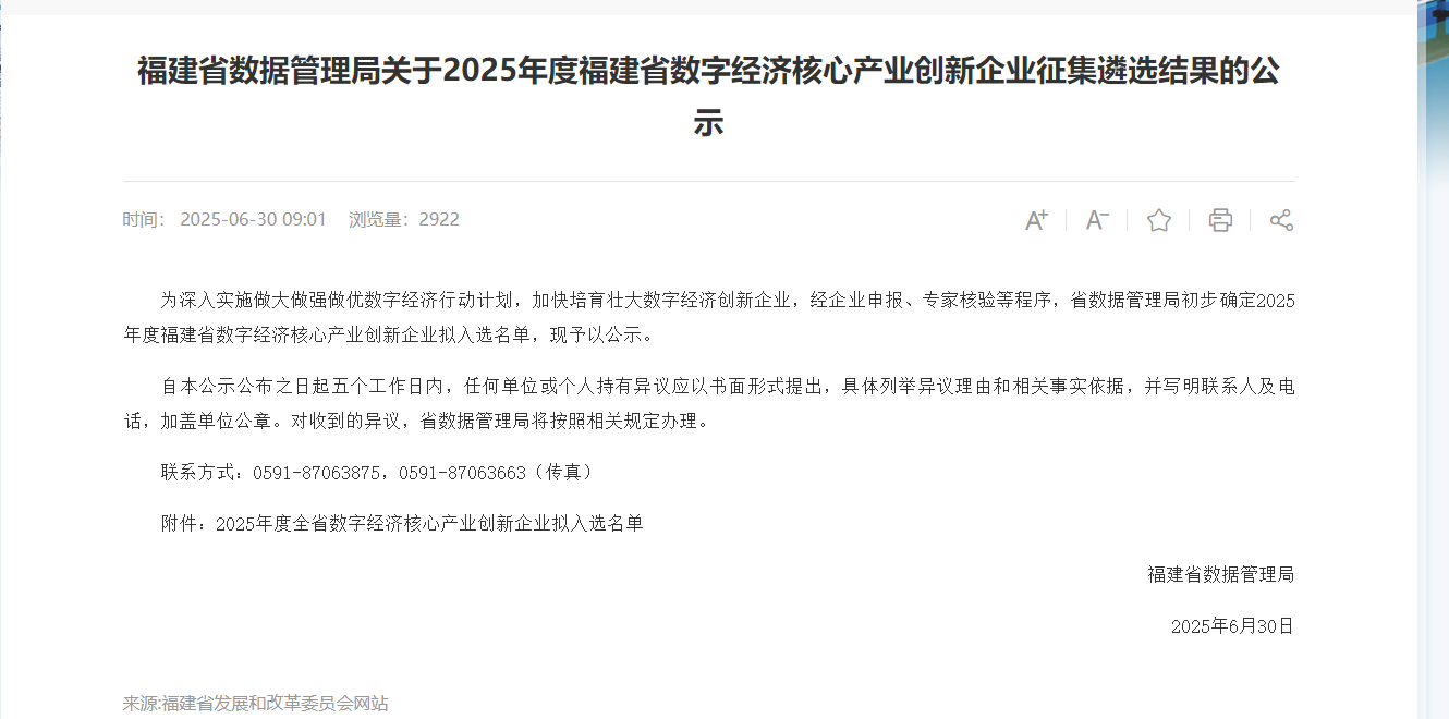 6月30日,福建省數(shù)據(jù)管理局正式公示《2025年度福建省數(shù)字經(jīng)濟(jì)核心產(chǎn)業(yè)創(chuàng)新企業(yè)名單》,市數(shù)據(jù)集團(tuán)及權(quán)屬企業(yè)海絲科技公司、數(shù)字城服公司成功入選2025年度福建省數(shù)字經(jīng)濟(jì)核心產(chǎn)業(yè)創(chuàng)新(瞪羚)企業(yè)。